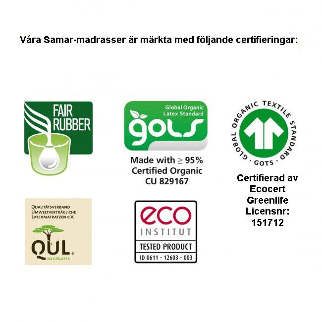 Samar – grunden för en hälsosam sömn: En 12 cm tjock kärna i tre olika fastheter utgör grunden för din sömn. Beroende på sovställning kan du välja mellan en ren naturgummikärna eller en kombination av lager av naturgummi och kokosgummi. Kärnan i Samar är täckt med lammull eller bomull (vegansk). Samars överdrag är tillverkade av enkel dräll, avtagbart och tvättbart.
