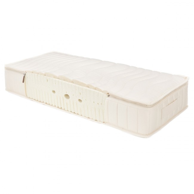 Naturgummi är ett fascinerande material med enastående egenskaper. Madrasser av naturgummi är extremt flexibla och punktelastiska, men relativt tungajämfört med konventionella madrasser av syntetiska material. För att göra det lättare för dig att transportera eller vända din madrass levererar vi därförtvå madrasskärnor när du köper madrasser bredare än 140 cm. Det exakt passande Prolana-madrassöverdraget ser till att de två madrasskärnorna hålls ihopoch att madrassen inte får någon märkbar skarv. –